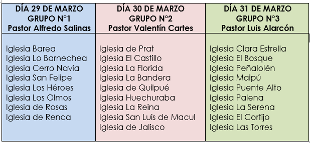 A nuestra Zona Metropolitana le corresponden los días 29, 30 y 31 de marzo, de los cuales se completarán estos tres días, con los tres grupos de mentoreo pastoral, por tanto, quedará conformado de la siguiente forma: