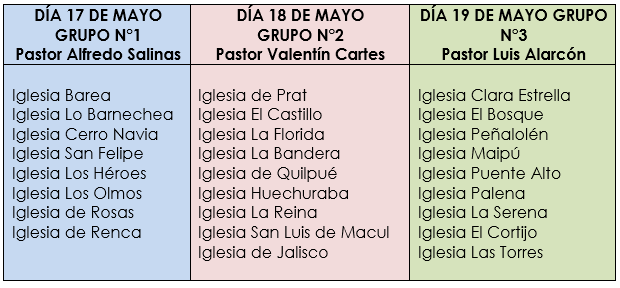 A partir del día 11 de mayo, se realizará la 2da. cadena de oración y ayuno a nivel nacional, añadiendo esta vez a las Iglesias de Argentina. A nuestra Zona Metropolitana le corresponde los días 17, 18 y 19 de mayo, de los cuales se completarán estos tres días, con los tres grupos de mentoreo pastoral, por tanto, quedará conformado de la siguiente forma: